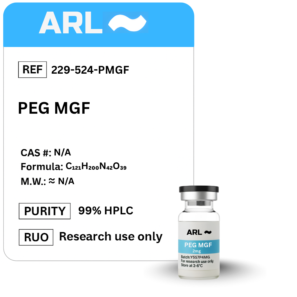 In response to mechanical stress, muscle injury, or ischemic/ischemia-like conditions, MGF is up-regulated locally in tissues and has been implicated in activation of satellite cells, myoblast proliferation, and tissue repair processes. PEGylation of MGF is designed to enhance bioavailability, reduce clearance, and thereby facilitate extended investigation of these mechanisms in controlled research environments. Key areas of investigation include muscle regeneration, bone and cartilage defect repair, and cellular signaling associated with growth factor-mediated tissue adaptation. By extending the half-life of the peptide, PEG MGF enables longer exposure periods and experimental modelling of sustained growth factor signalling.